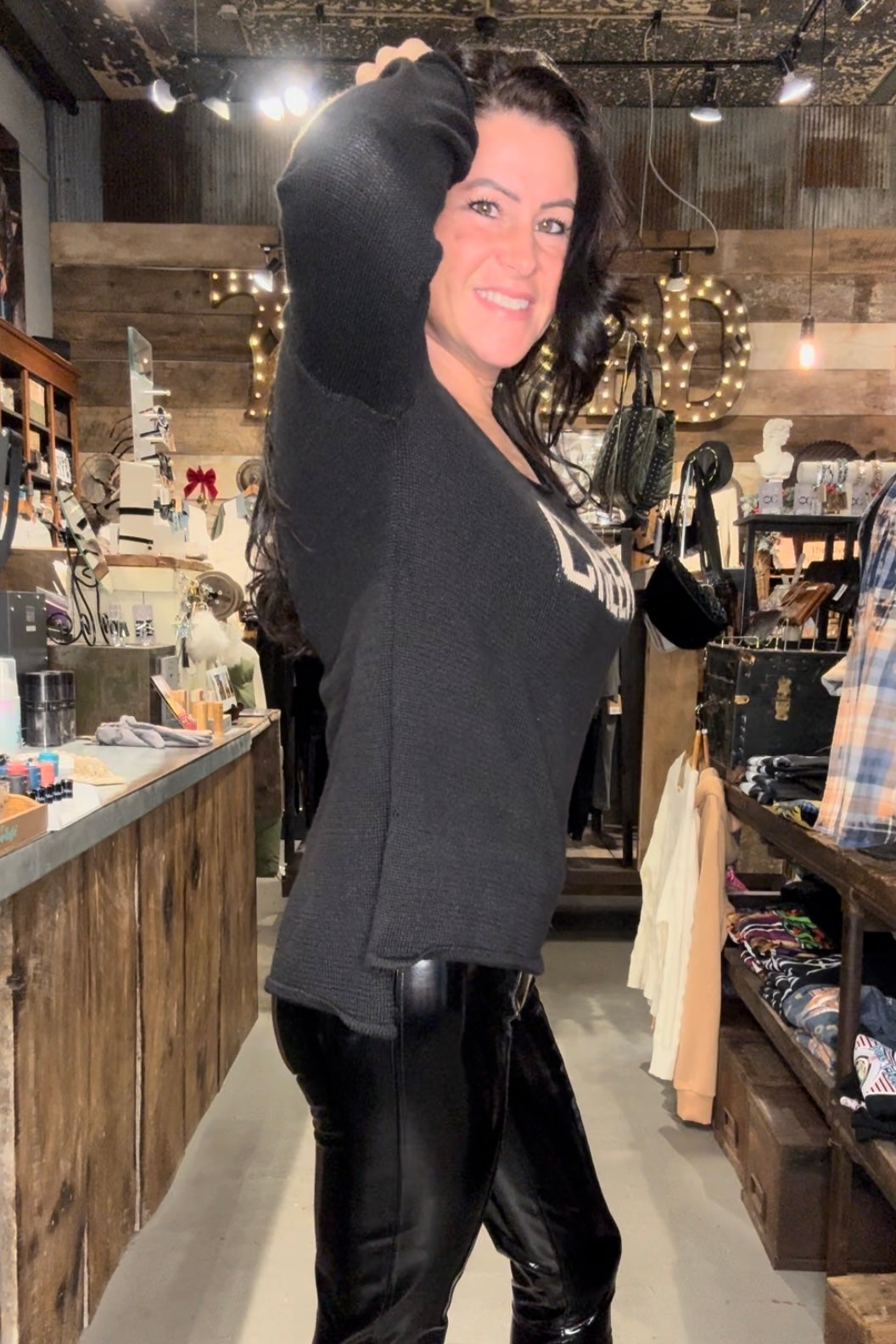This light sweater is soft and classy. We love it over leggings but it also pairs well with jeans. It has a slight hi-lo hem with a small slit on the sides.