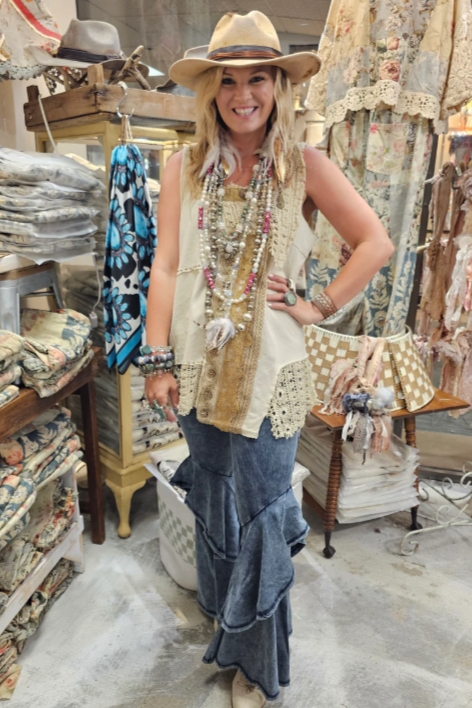 This pretty cami features vintage lace and has beautiful buttons in a layered look that adds amazing detail to any outfit.