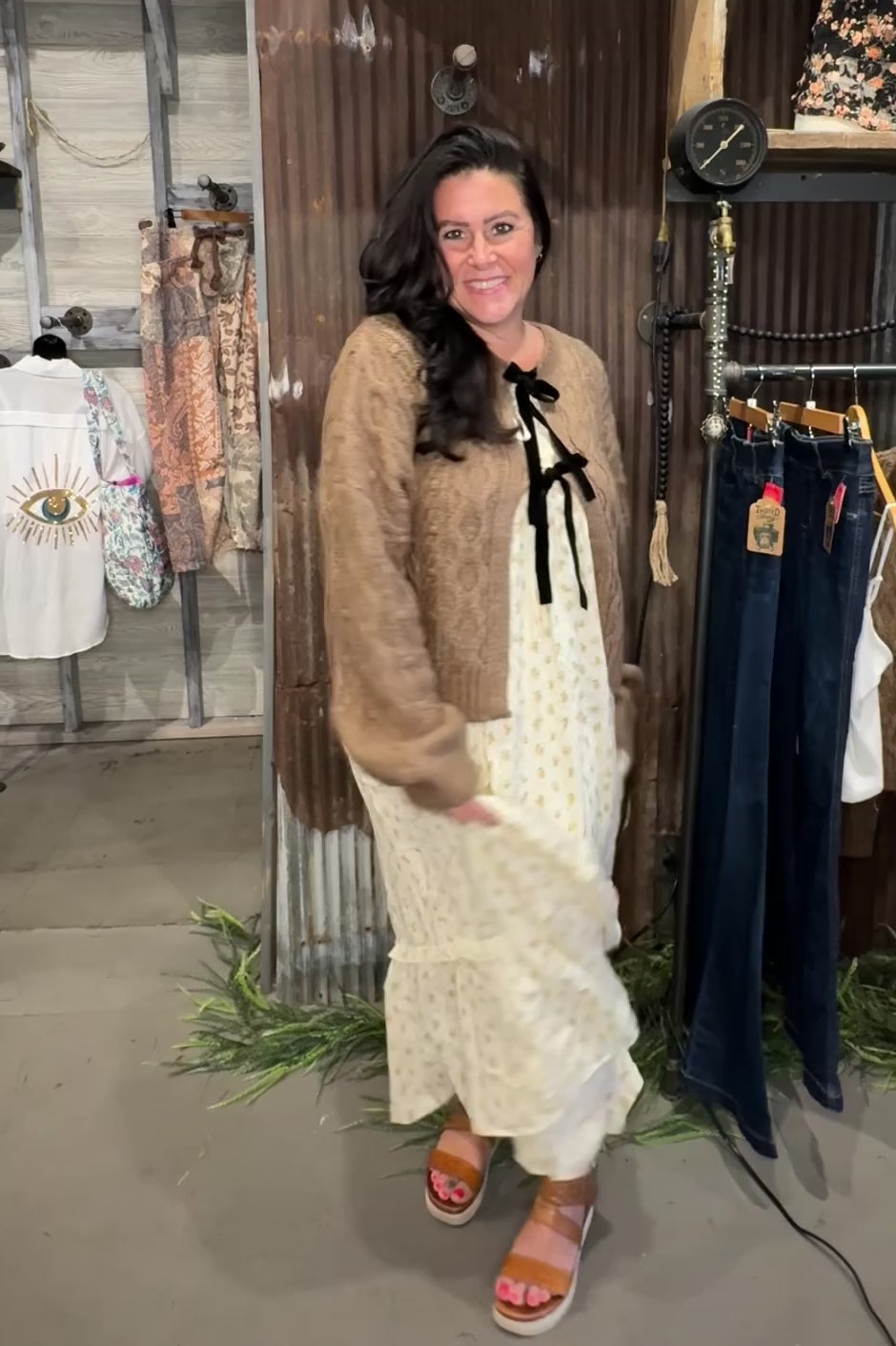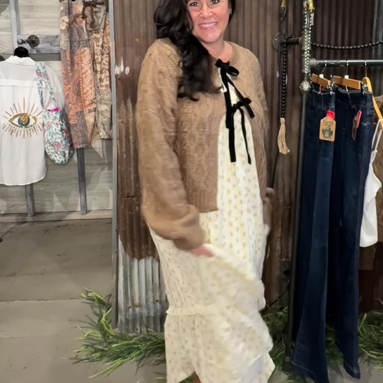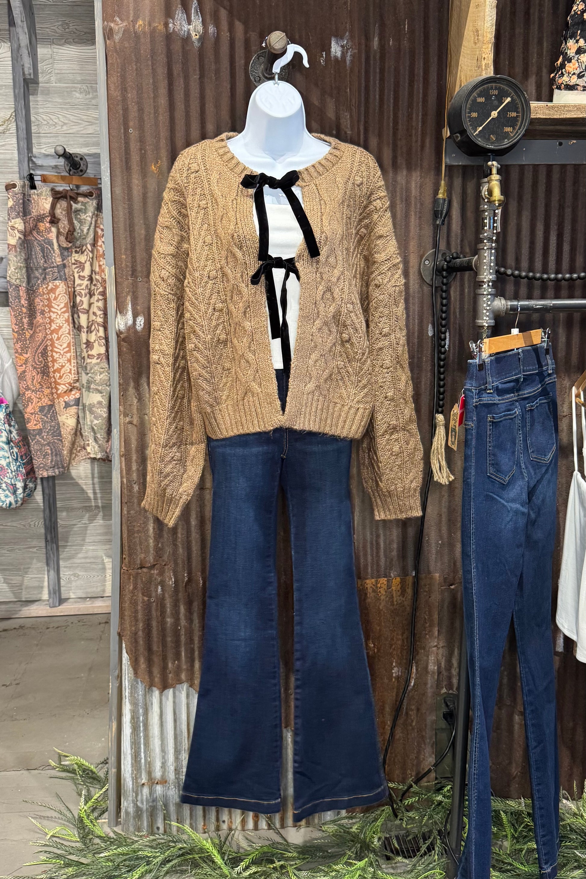 This adorable cable knit sweater features a round neck line and drop shoulder seam. It's just the right balance of sweet but sassy. We can't get enough of it. Pairs with shorts, jeans or dresses. We love it over a white top. The ties are velvet.