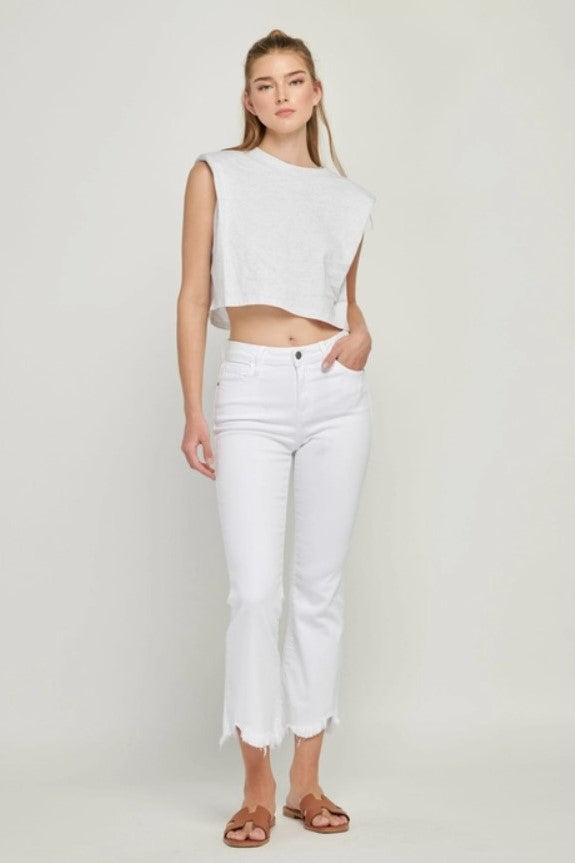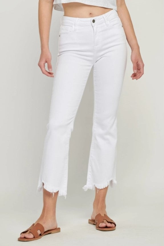 WHITE CROPPED FRAYED FLARE WITH 93% COTTON/ 5% POLYESTER/ 2% SPANDEX.