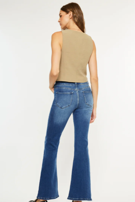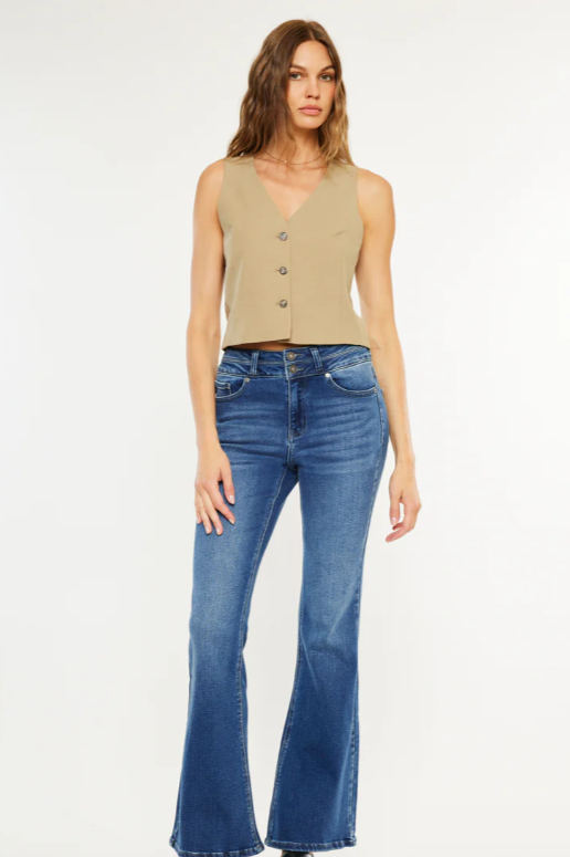 Live in your favorite denim with this staple pair of flare jeans featuring slight whiskering, fading, contrast stitching, a high-rise waistline, a double waistband, 2-piece button closures, and a 5-pocket design.