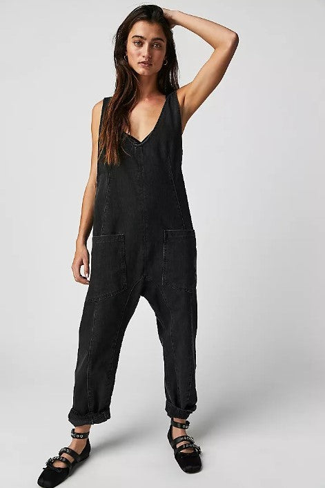 One-and-done and so simple, this denim jumpsuit from the We The Free Collection is featured in a relaxed fit and cropped ankle-length style with harem legs and a low scoop neckline.